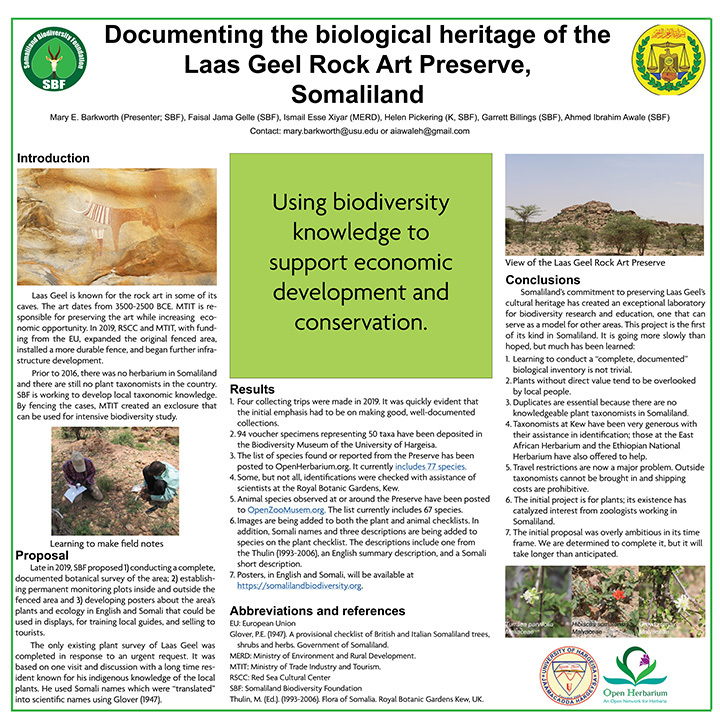 There are many useful web sites. The Biodiversity Museum shares specimen- and imaged-based information about Somaliland's biodiversity via OpenHerbarium and OpenZooMuseum. Information on how to use them is on Biodiversity Knowledge Sharing. The herbarium ercords from The Biodiversity Museum are also shared with the Global Biodiversity Information Facility.
